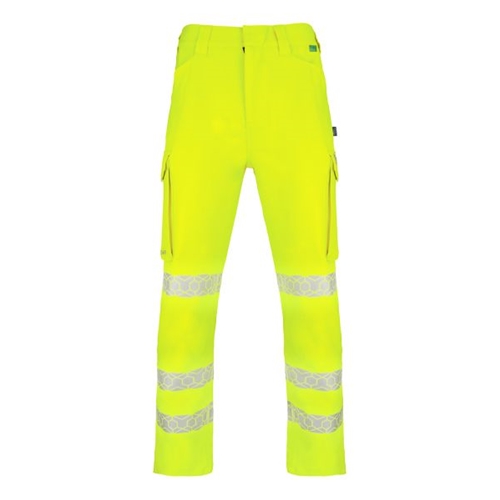 Envirowear High Visibility trousers designed to be recycled, using mono-fibre design principles. rPet generated can be used in all kinds of polyester clothing and accessories. Made from 240gsm 100% polyester twill fabric. Features triple sewn seams for durability, 7 belt loop waistband, 2 cargo pockets and hexpatterned heatseal Retro-Reflective tape. available in short, regular and tall sizes. Machine washable at 40 degrees C up to a maximum of 25 cycles.